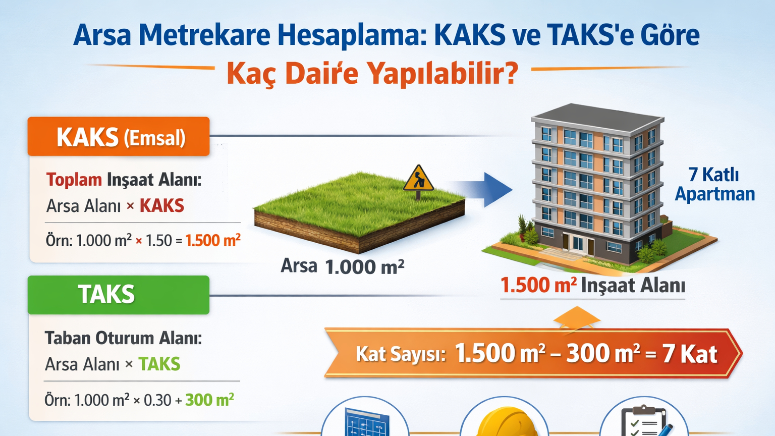 Bir arsaya kaç daire yapılabileceği, hem yatırımcılar hem de arsa sahipleri için en çok merak edilen konuların başında gelir. Arsa üzerine ev yapmak ya da kentsel dönüşüm sürecine girmek isteyenler için arsa metrekare hesabı, inşaatın fizibilitesini doğrudan etkiler. Bu yazıda, KAKS, TAKS, emsal, toplam inşaat alanı ve kat sayısı gibi kavramları sade bir dille açıklıyor, örnek hesaplamalarla konuyu netleştiriyoruz.